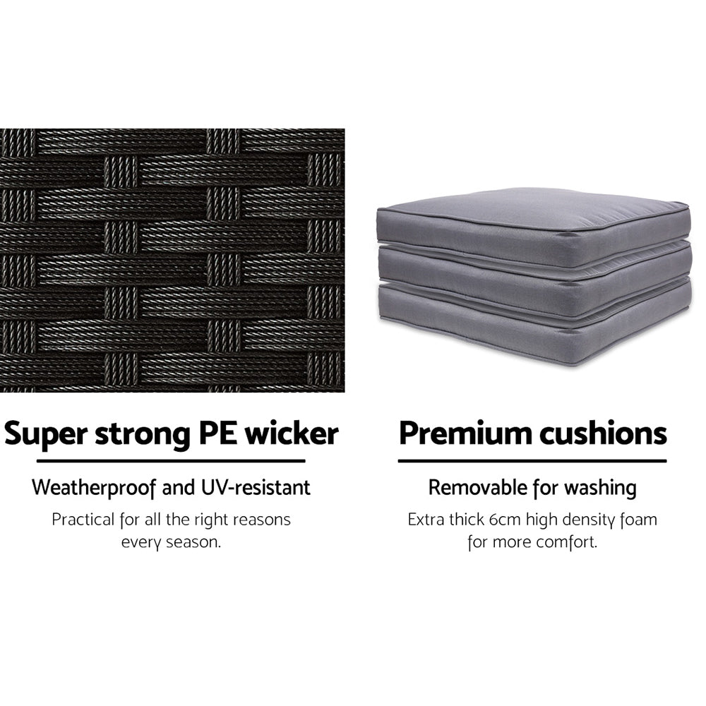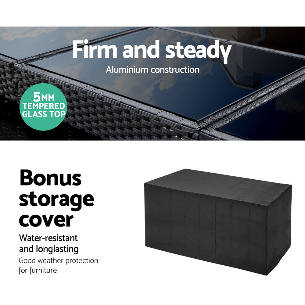 Looking as stunning as ever in an upgraded design, our Gardeon Outdoor Bar Set certainly deserves its coveted space in your lovely backyard, deck or patio. With its chic and trendy profile, the bar set comes with a table and matching bar stools, with ample seating for all your friends and family. And as the seats have inclined backrests and extra-comfy 5cm thick foam cushions, you can socialise for hours on end without aching backs or bottoms. If you spill your drink, the 5mm tempered glass tabletop and removable seat cushion covers make cleaning up hassle-free. With powder-coated steel construction and quality PE wicker finish, the bar set is designed to handle the rain and sun without any worries for years to come, and there is also a bonus water-resistant storage cover included for added protection. When not in use, you can save loads of space simply by pushing the chairs under the table, as the bar set has a space-saving integrated design and fits together perfectly like a puzzle.